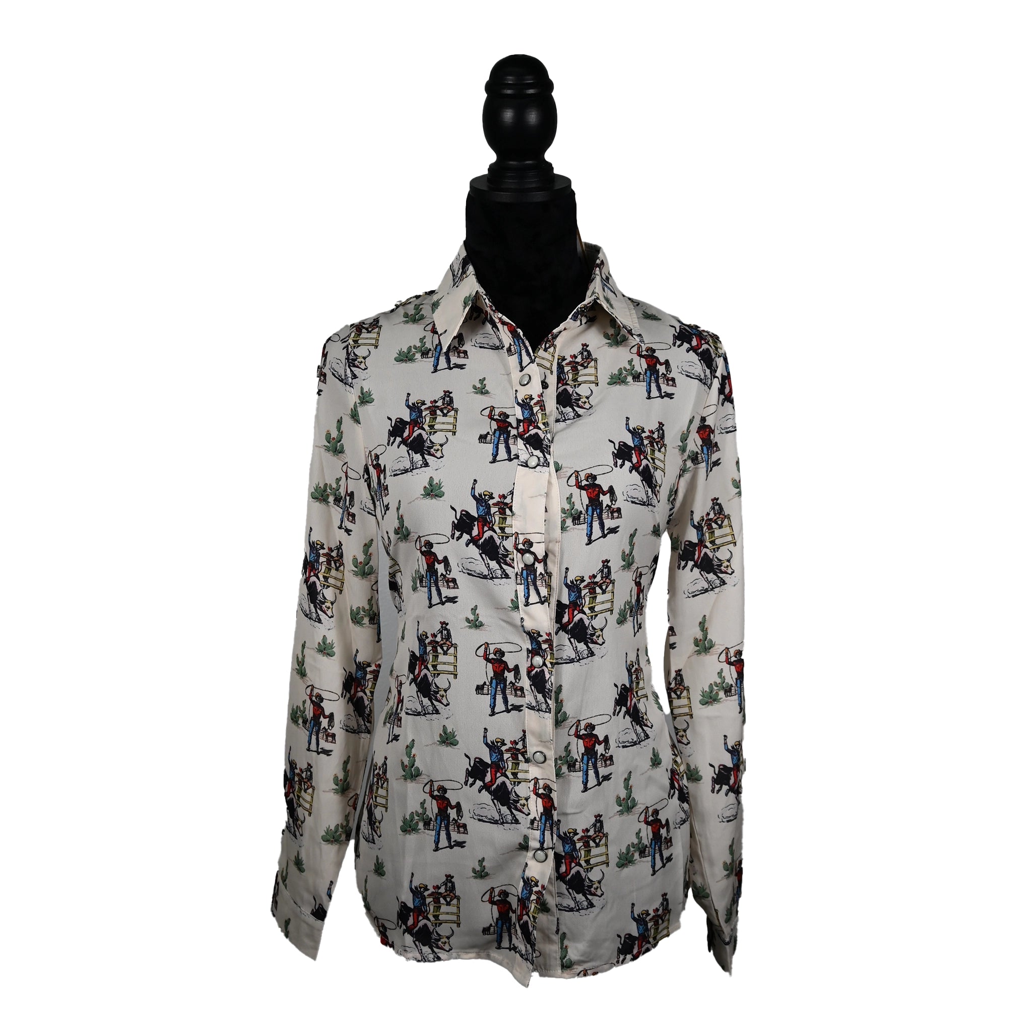Rodeo-ready style with a vintage twist. This lightweight button-up features all-over cowboy and ranch prints, perfect for adding western charm...