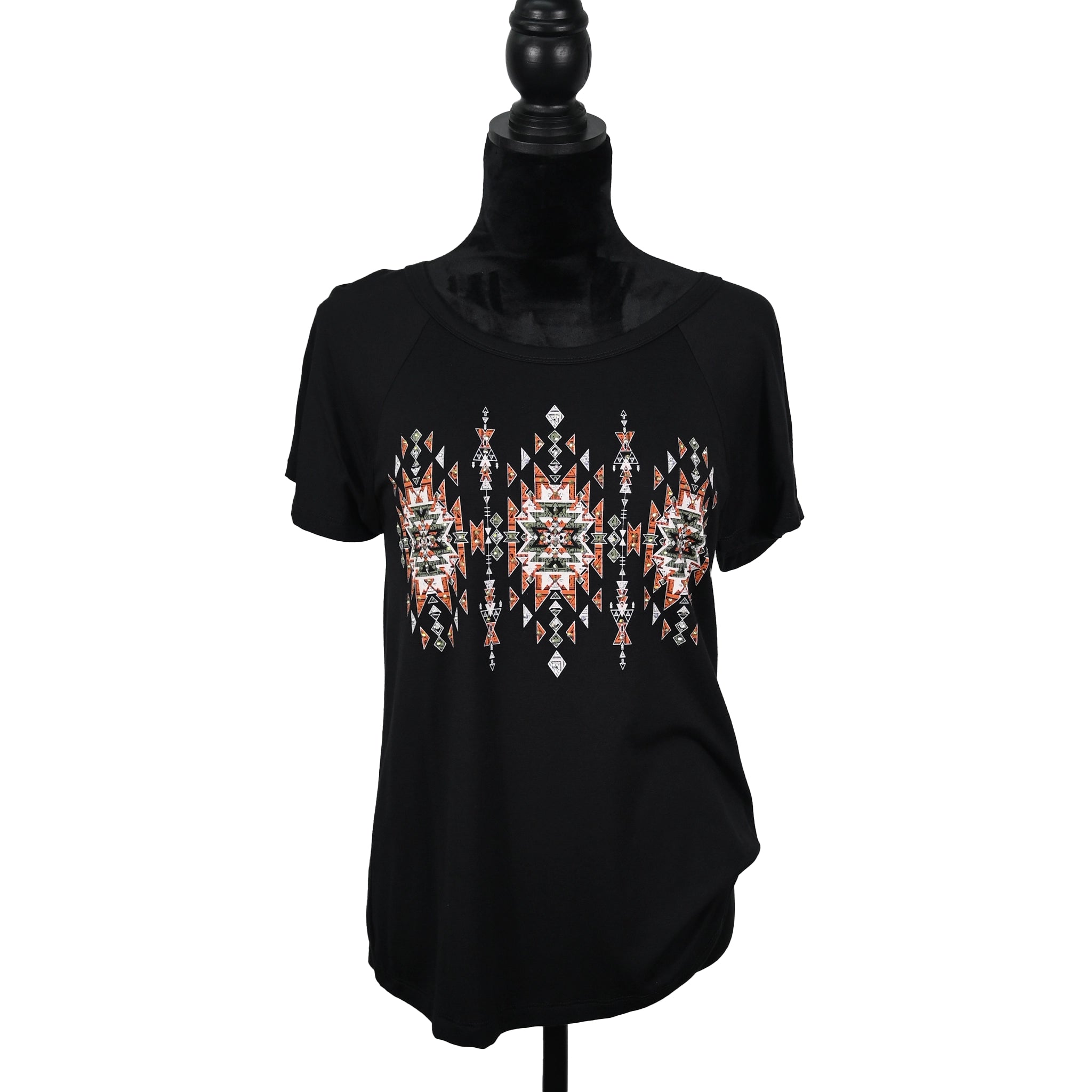 Show off your bold side with this black tee featuring a striking Aztec-inspired print across the front. Soft, breathable fabric...