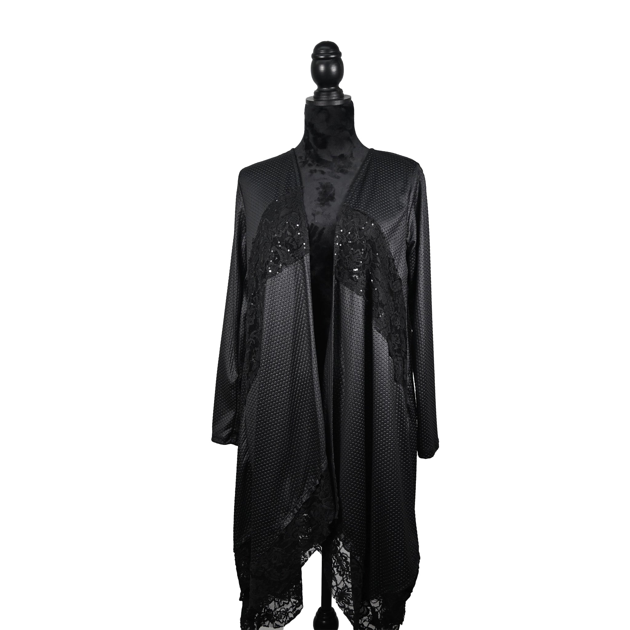 This elegant black duster features a subtle circle pattern fabric, tonal sequin embellishments, and sheer lace trim for a graceful,...