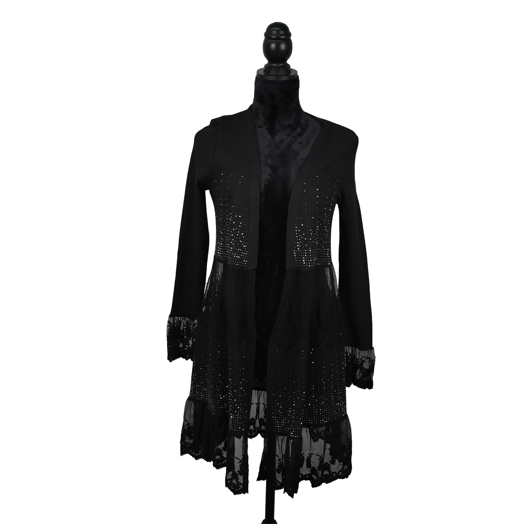 Drape yourself in elegance with this black sequin cardigan, featuring a soft knit body with shimmering sequin accents and romantic...