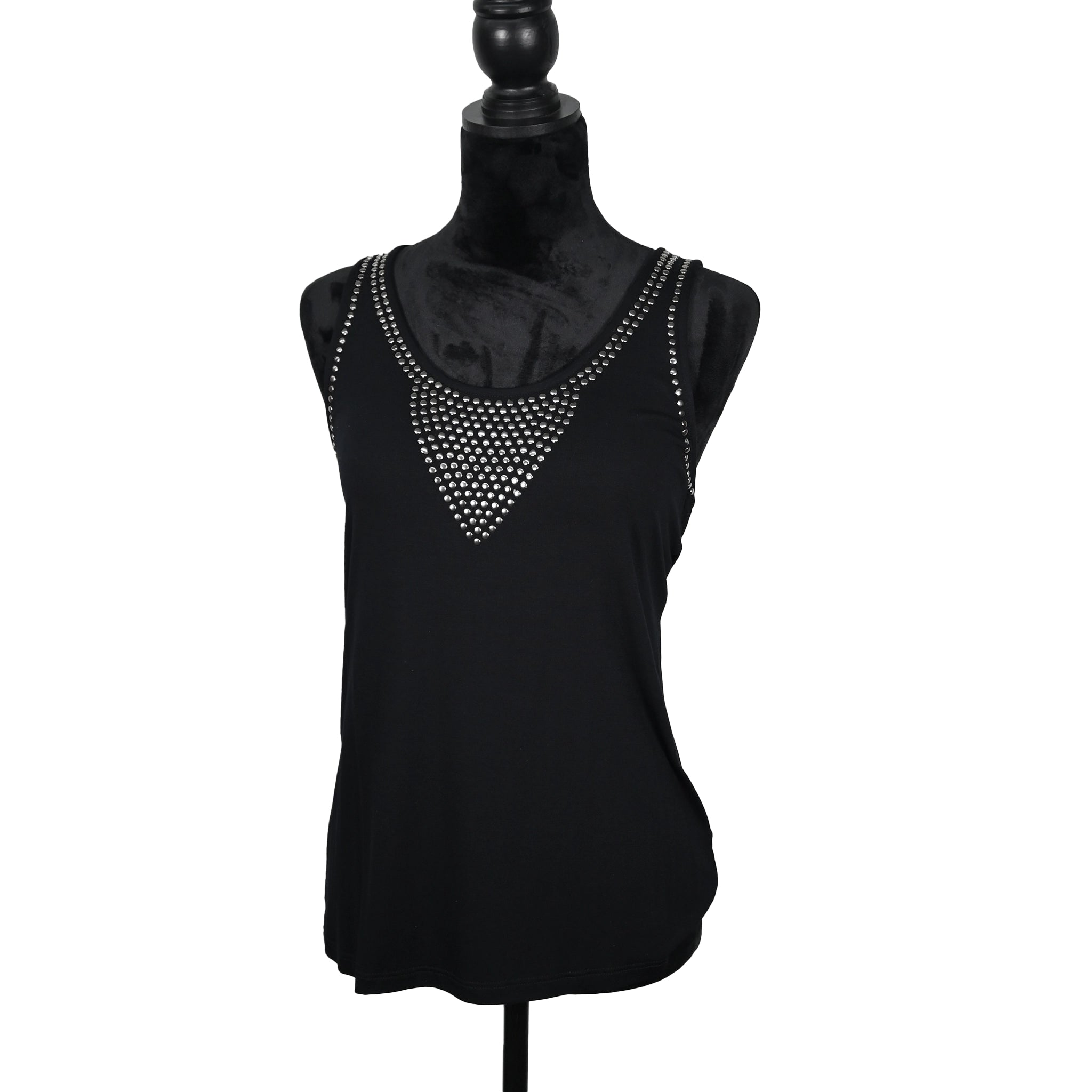 Sleek and bold, this black tank is elevated with a V-shaped pattern of glossy black studs along the neckline. Crafted...