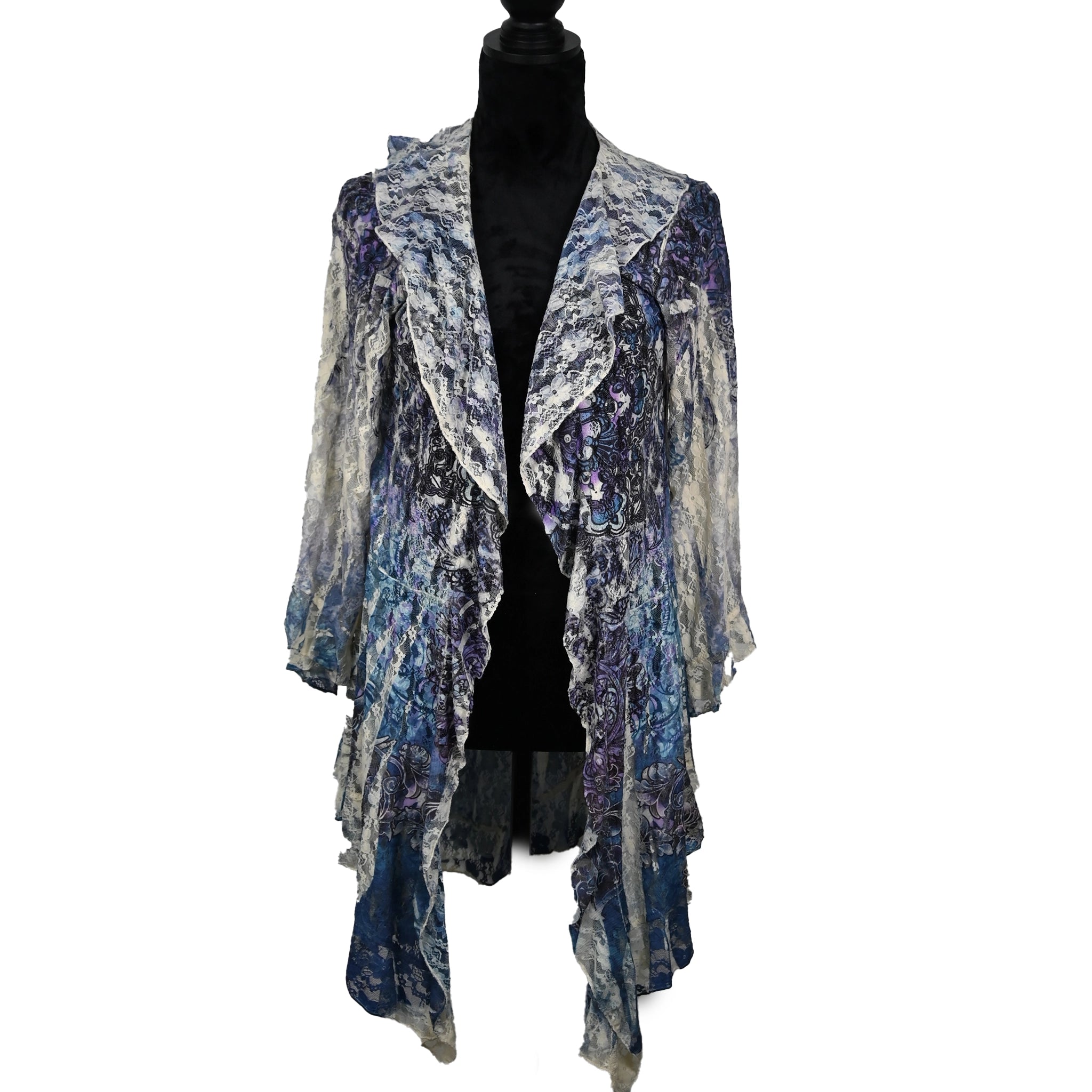 A flowing single-ruffle kimono adorned with a dreamy blend of blue and purple lotus florals layered under soft ivory lace....