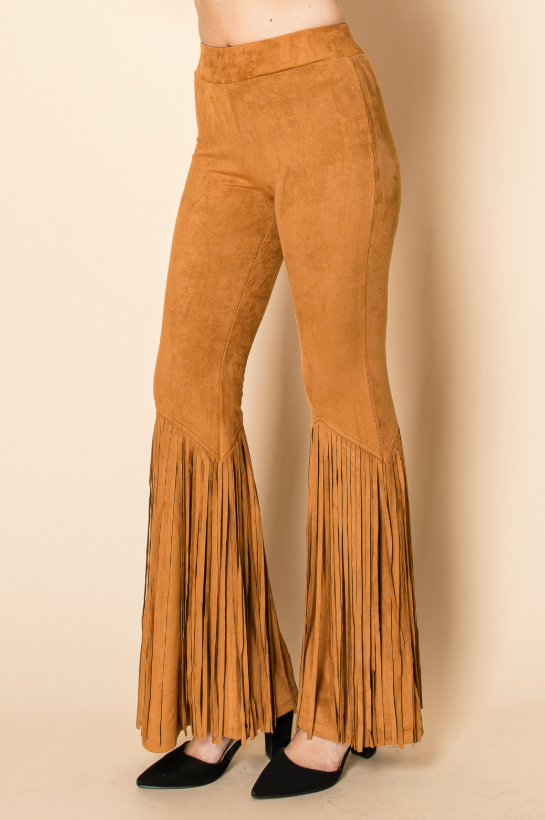 Add a pop of boho charm with these camel fringe flare pants. Crafted from soft faux suede, they feature long...