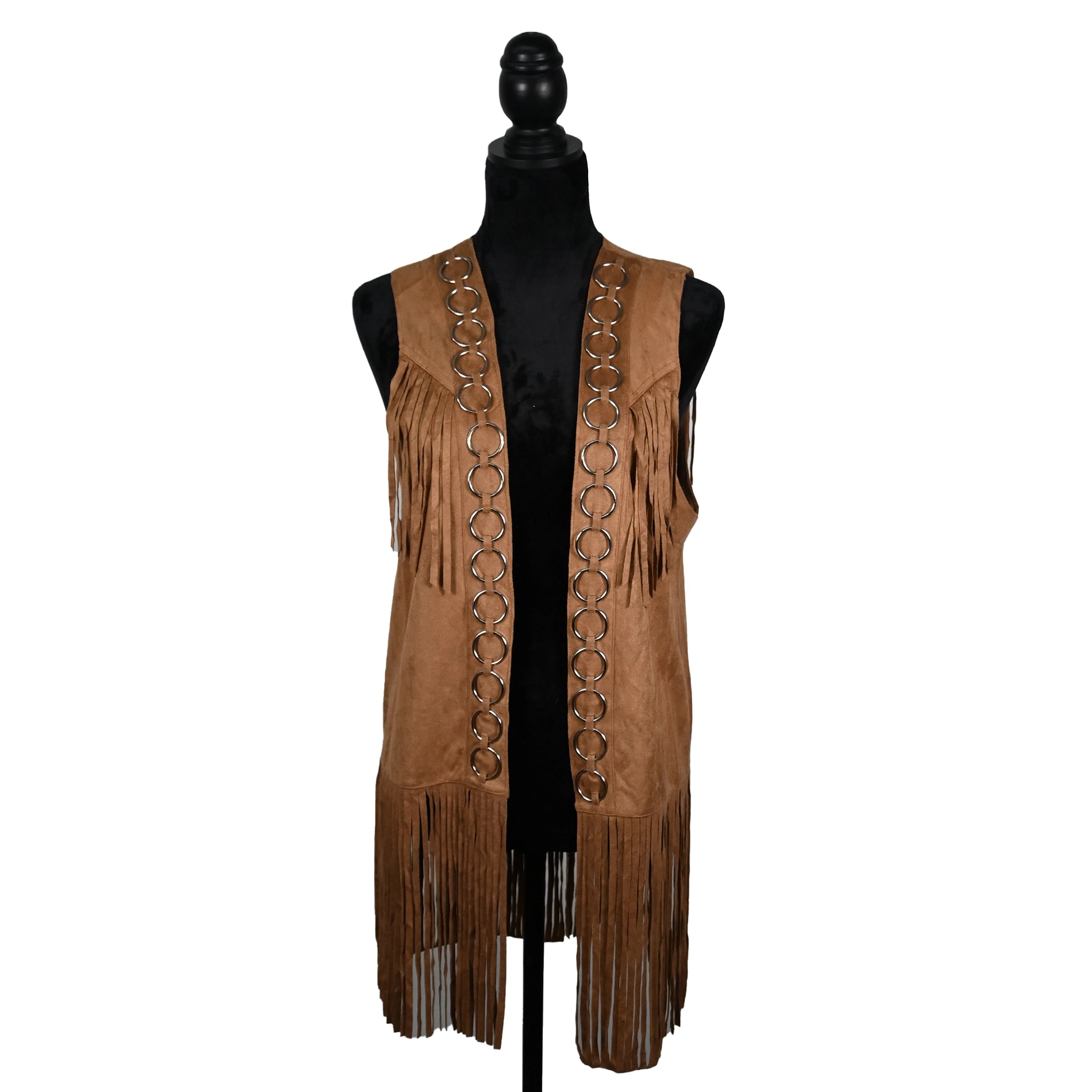Crafted in a soft suede-style fabric, this camel-colored vest features dramatic fringe along the chest and hem with bold silver...