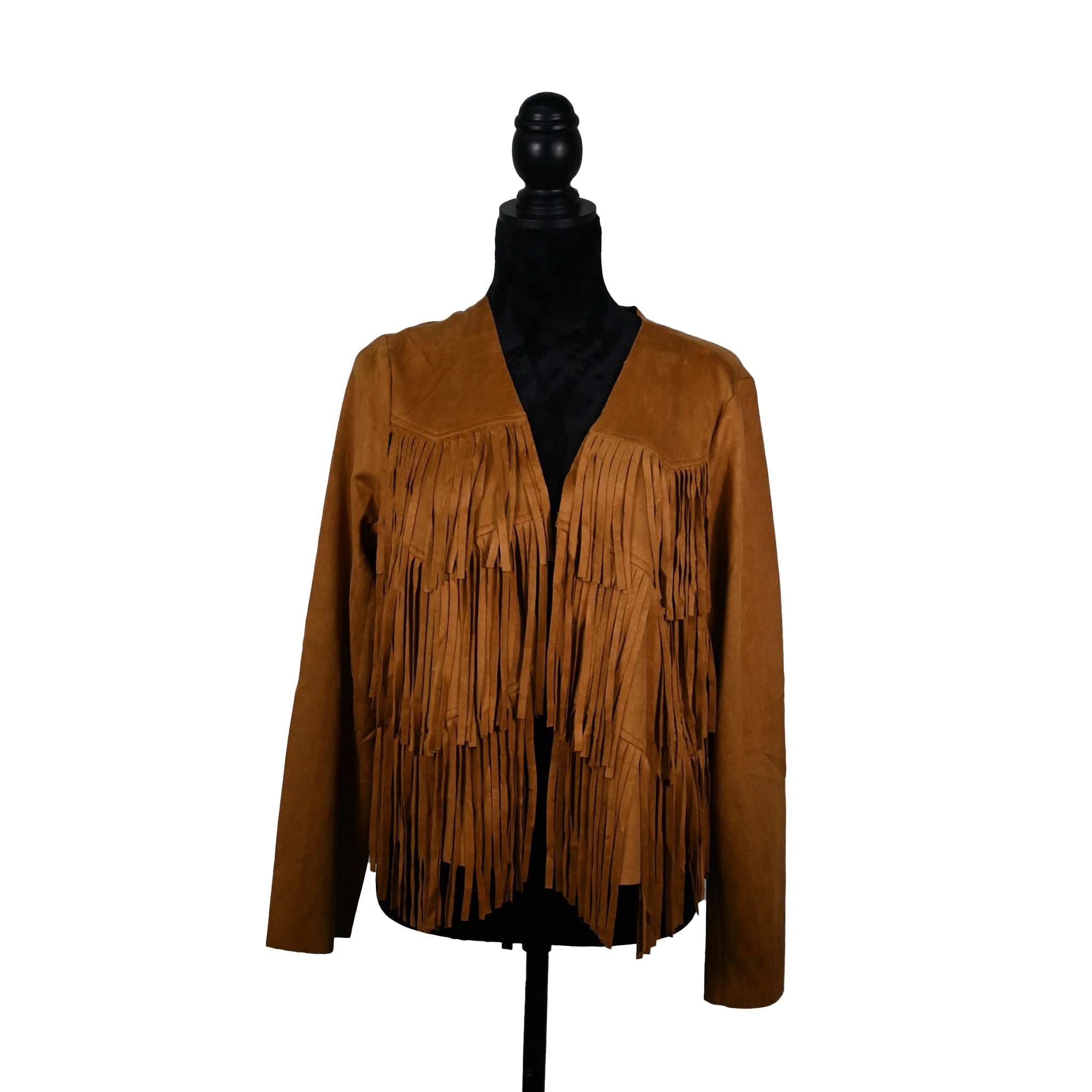 Add a Western-inspired edge to your wardrobe with this camel suede fringe jacket. Featuring soft suede fabric and double layers...