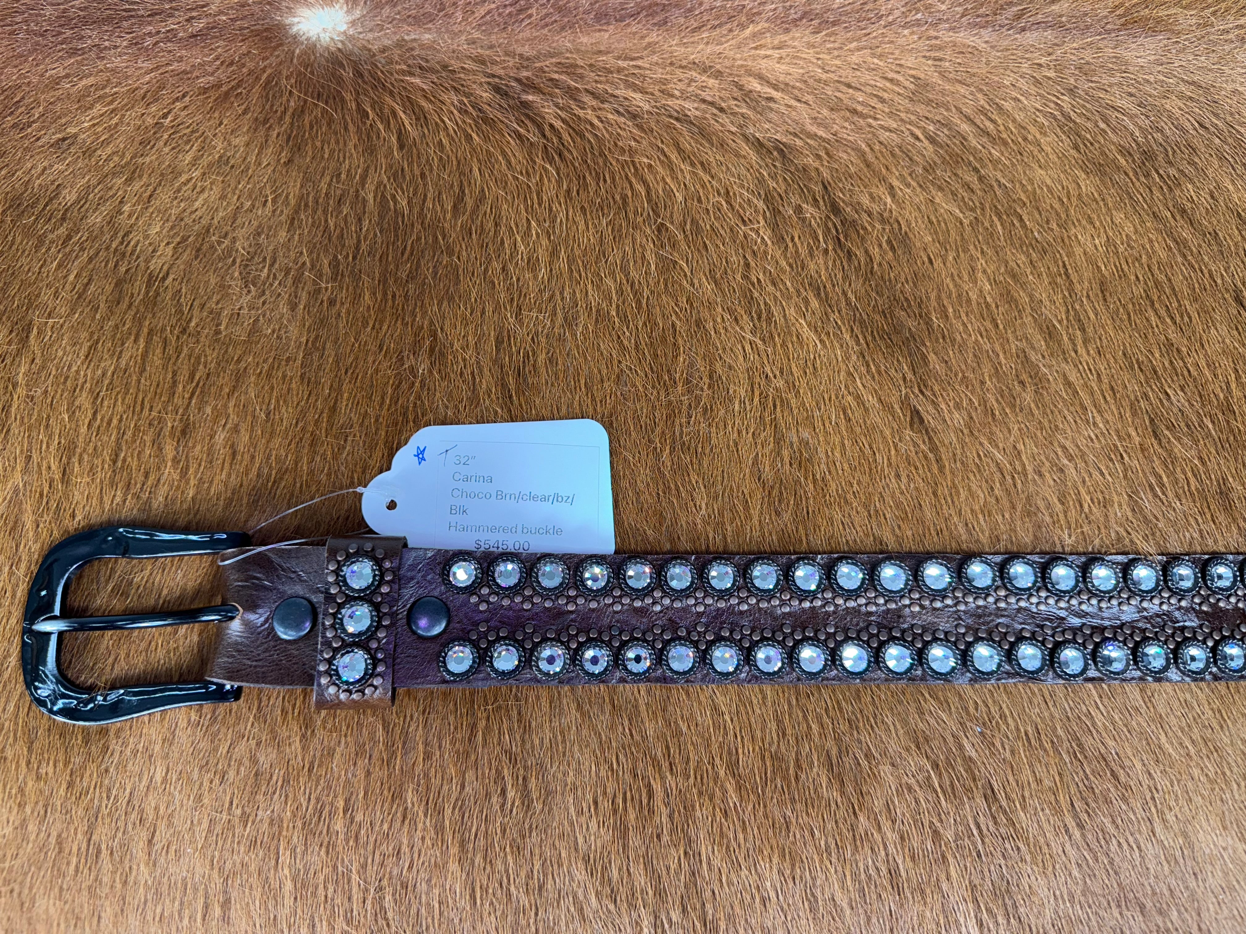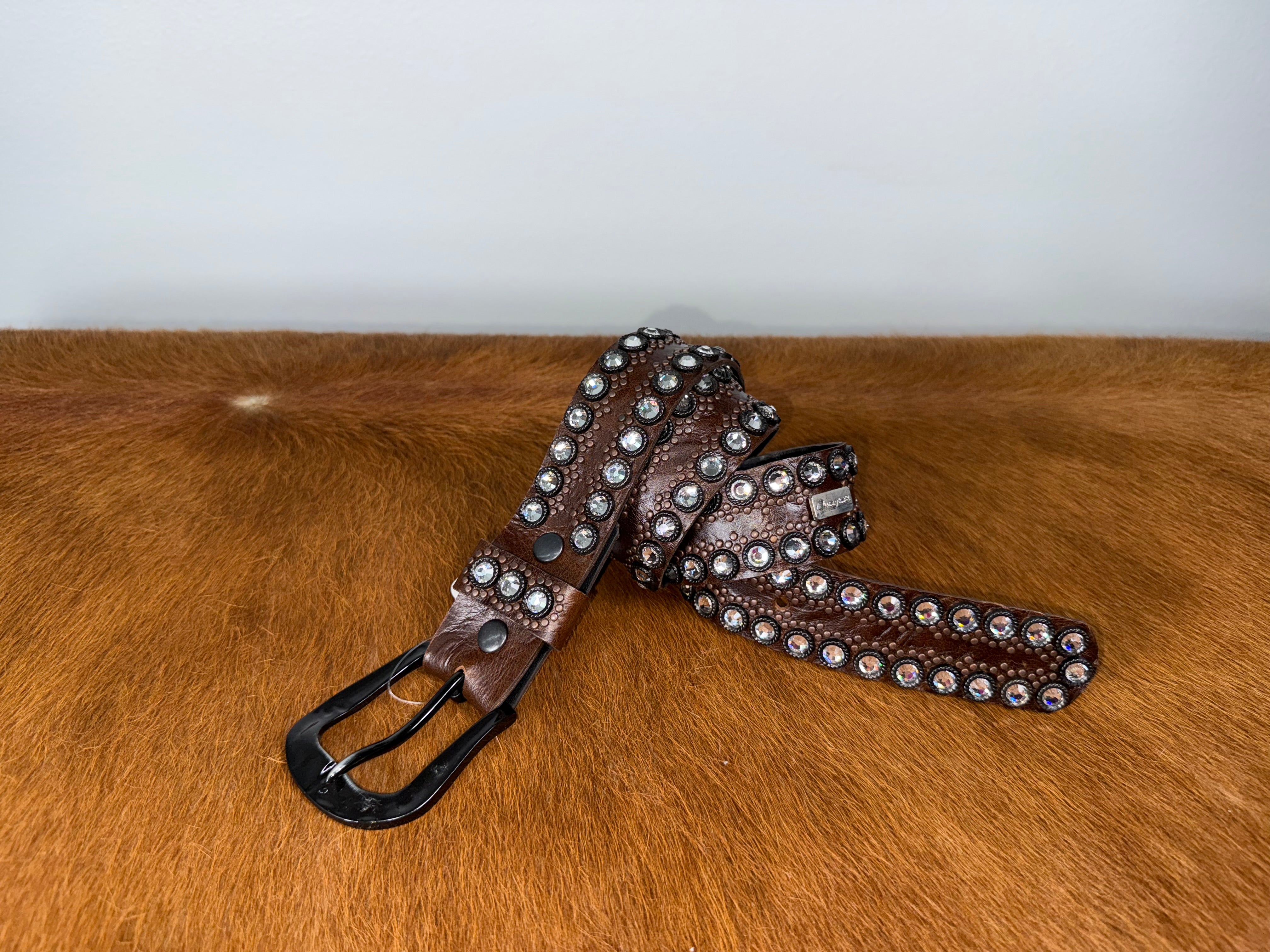 Size 32 T (true to size) size from fold to middle hole Beautiful Chocolate brown leather2-row clear/ black metal, bronze...