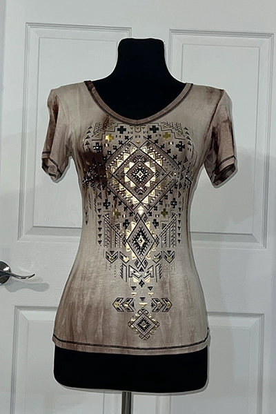 Shine with effortless western style in the Golden Desert Tribal Tee. This soft, sand-washed top features a striking metallic tribal...