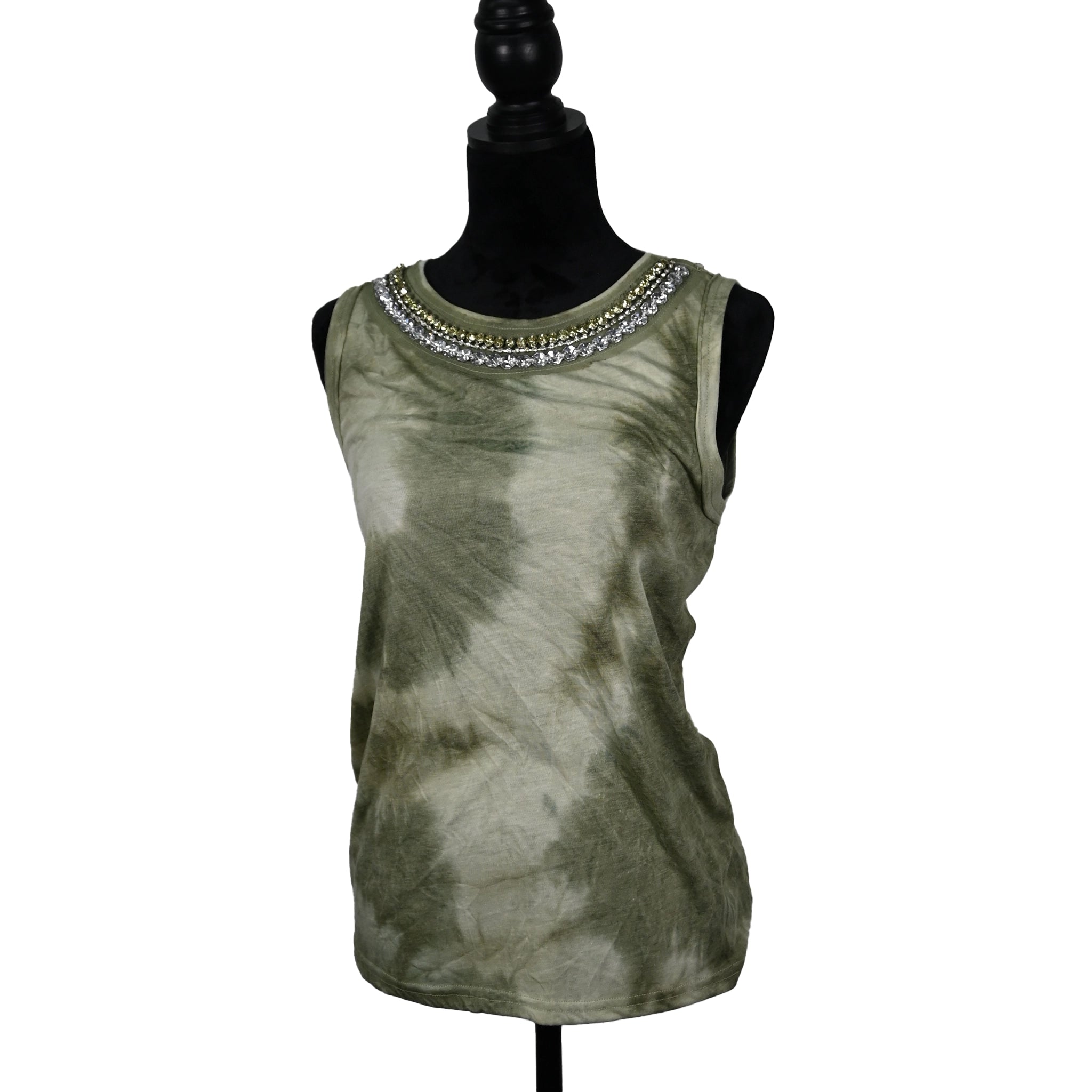 Fresh and fierce—this green tie-dye tank blends earthy vibes with shimmering sophistication. Featuring a crystal-adorned collar and soft, breathable fabric,...