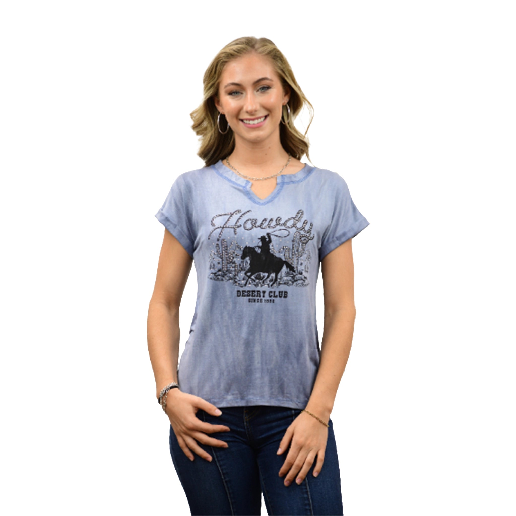 Say “Howdy” in style with this soft blue tee featuring a vintage cowboy graphic and Western desert scenery. The subtle...