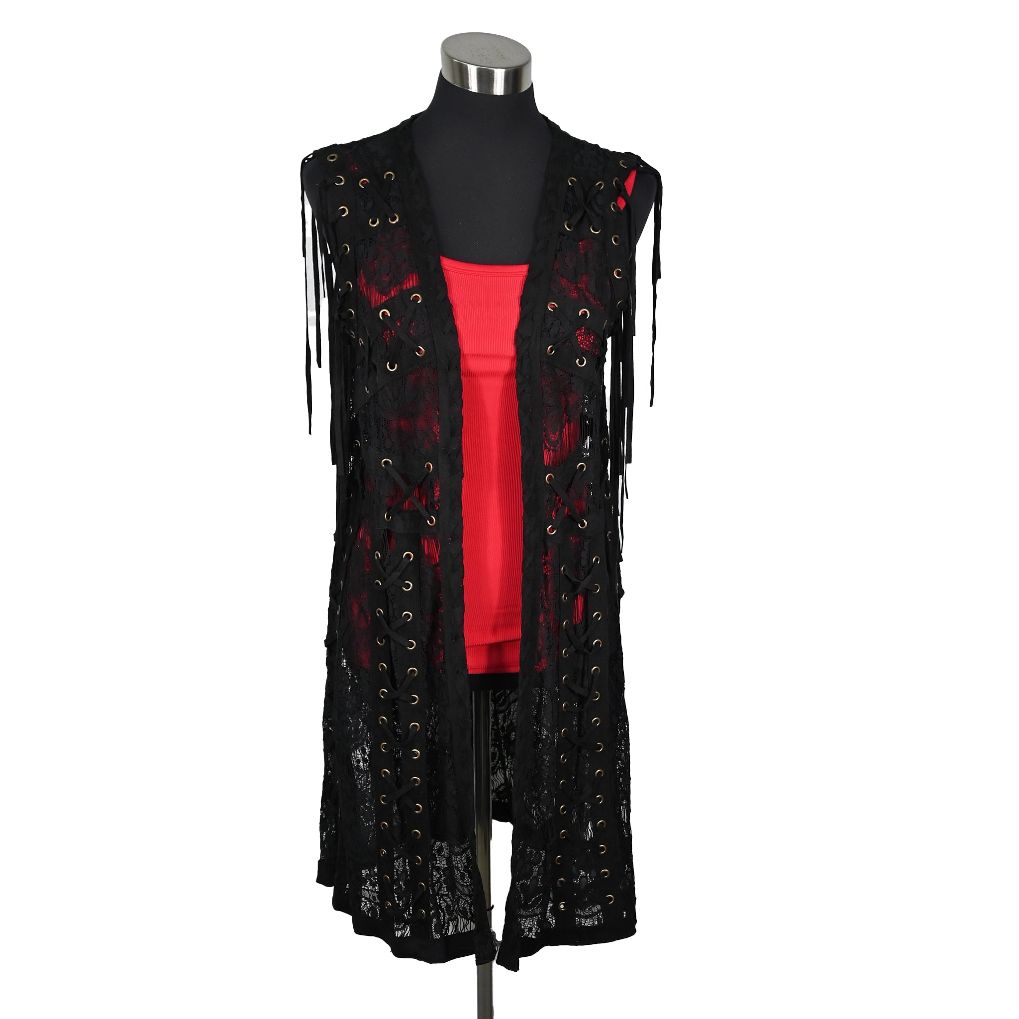 This edgy black vest features a sheer lace base with bold lace-up detailing and metal grommets throughout. Accented with side...