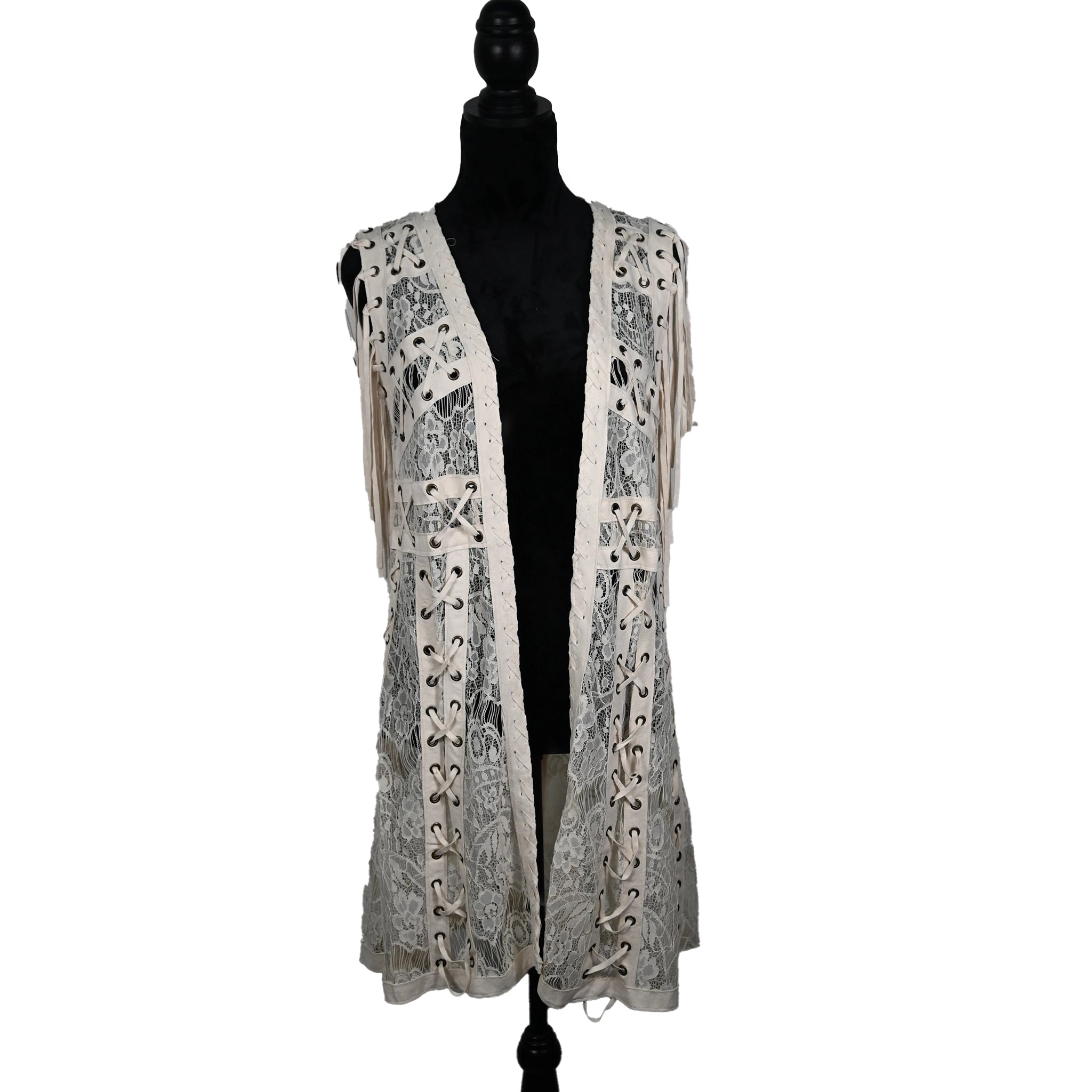 This romantic vest combines delicate creamstone lace with bold crisscross lacing and grommet accents for a modern boho edge. Intricate...