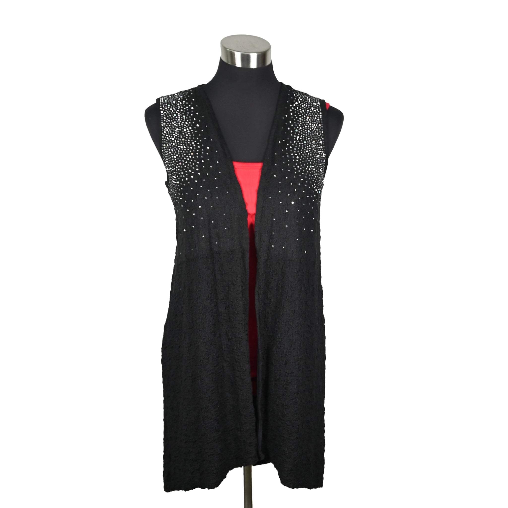This sleek longline black vest features a textured base adorned with scattered crystal embellishments that sparkle from shoulder to waist....