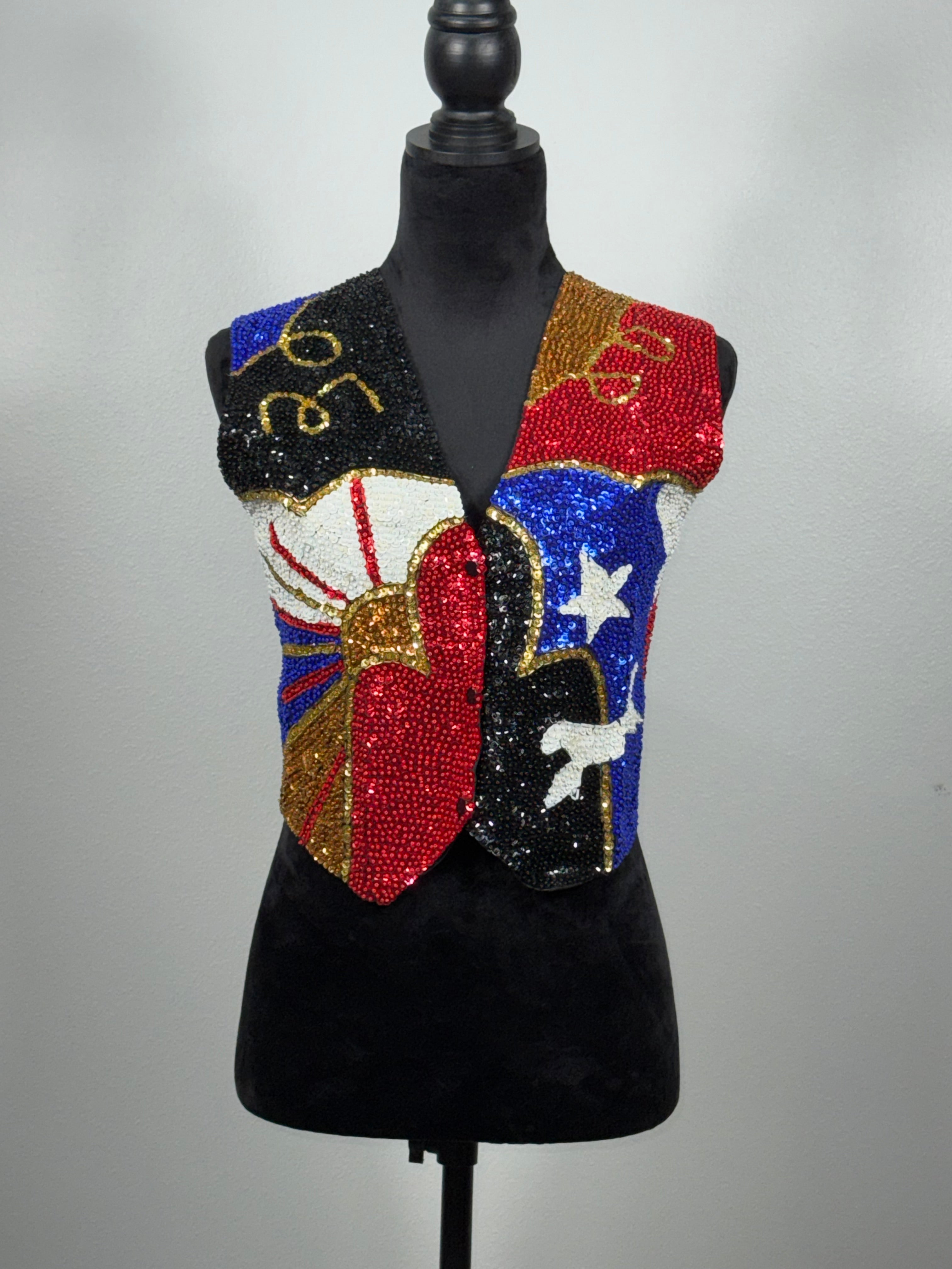 Sequin vests are made in Indonesia by placing each sequin and seed bead on by a needle and thread. Handmade....