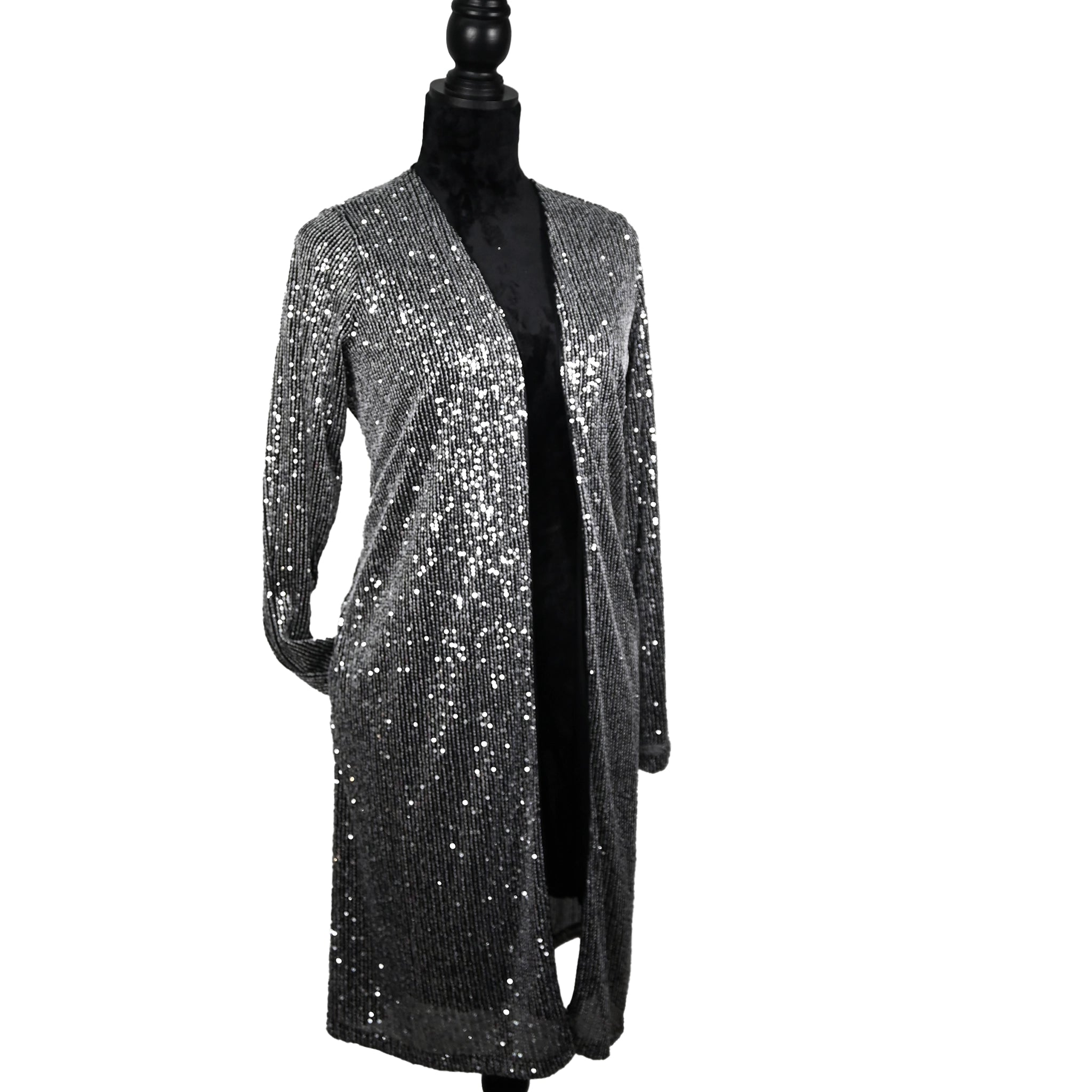 Shine bright in this full-length silver sequin Cardigan. With its open front and sleek silhouette, it’s the perfect statement piece...