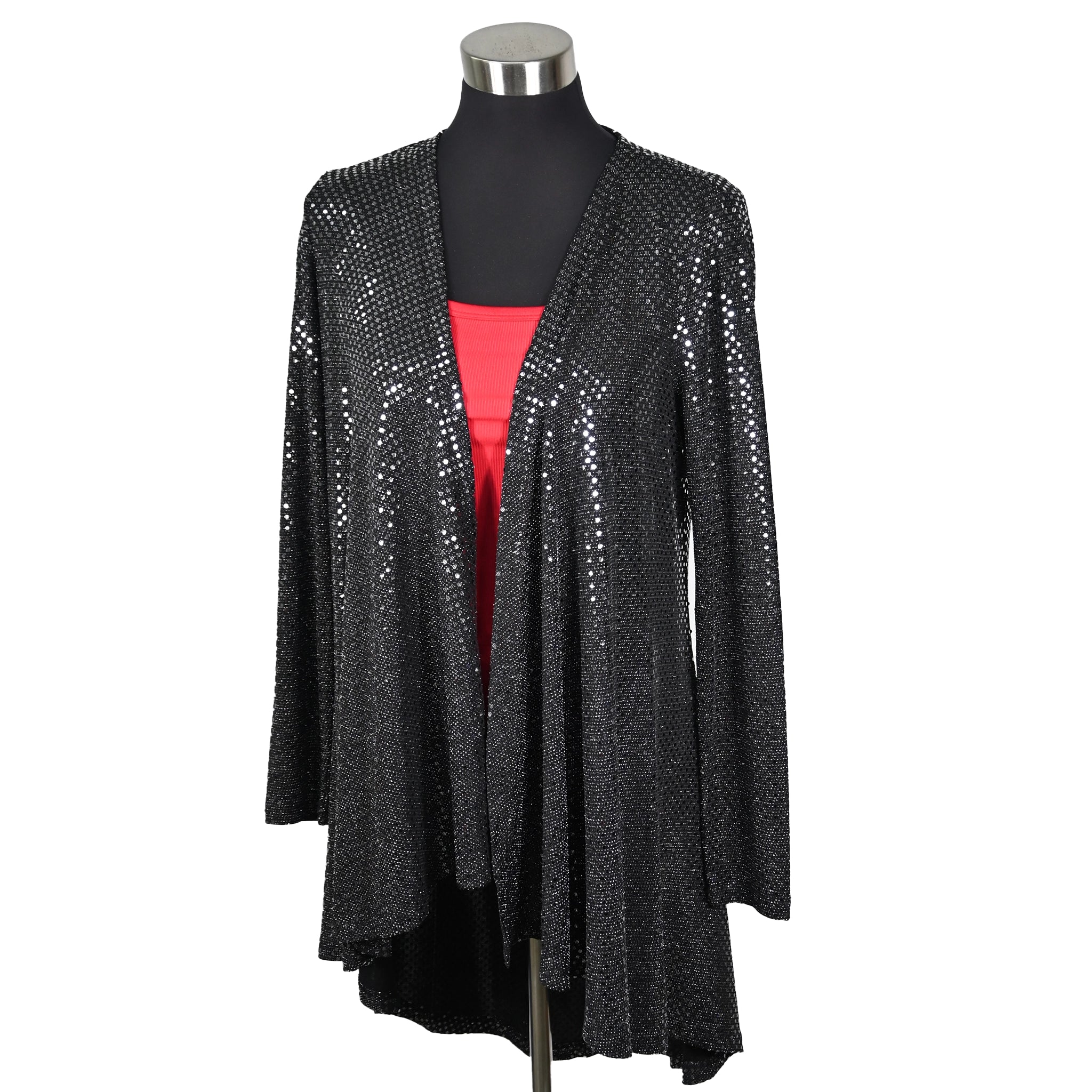 Turn heads in this dazzling black duster covered in shimmering silver spot sequins. With a flowy open front and dramatic...
