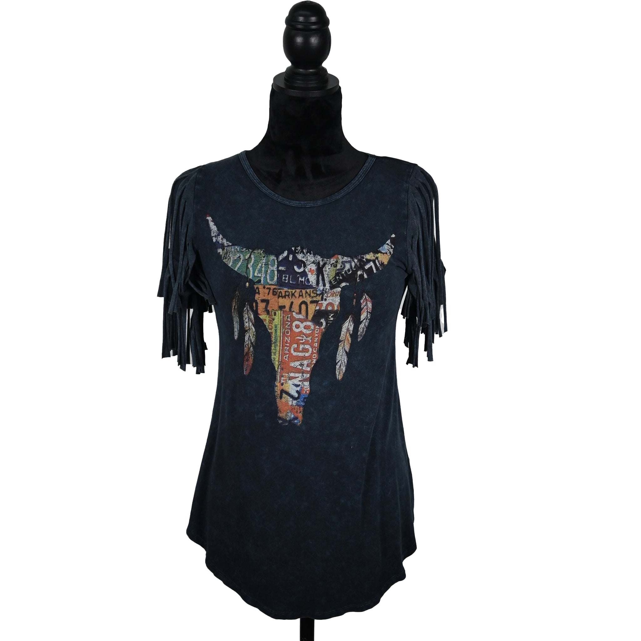 Stone Wash Blue Fringe Tee – License Plate Longhorn