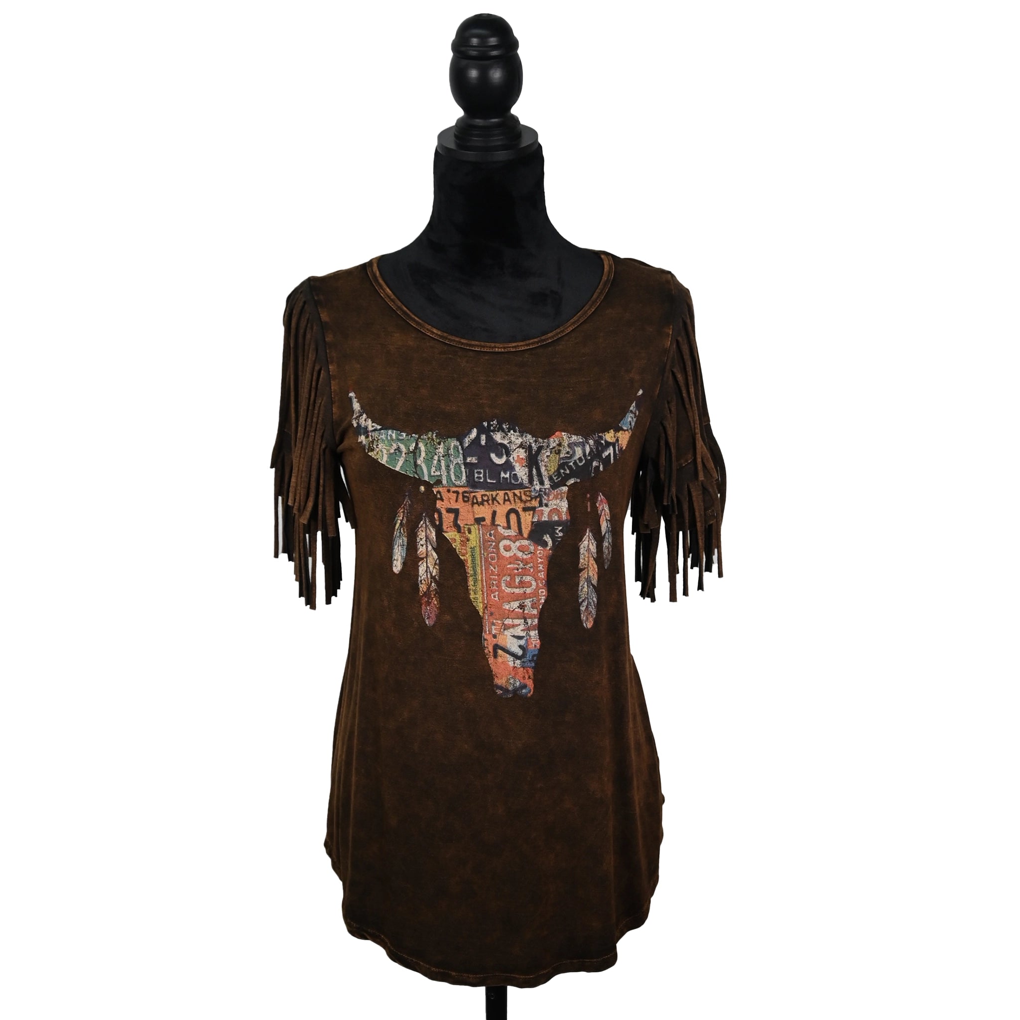Stone Wash Brown Fringe Tee – License Plate Longhorn