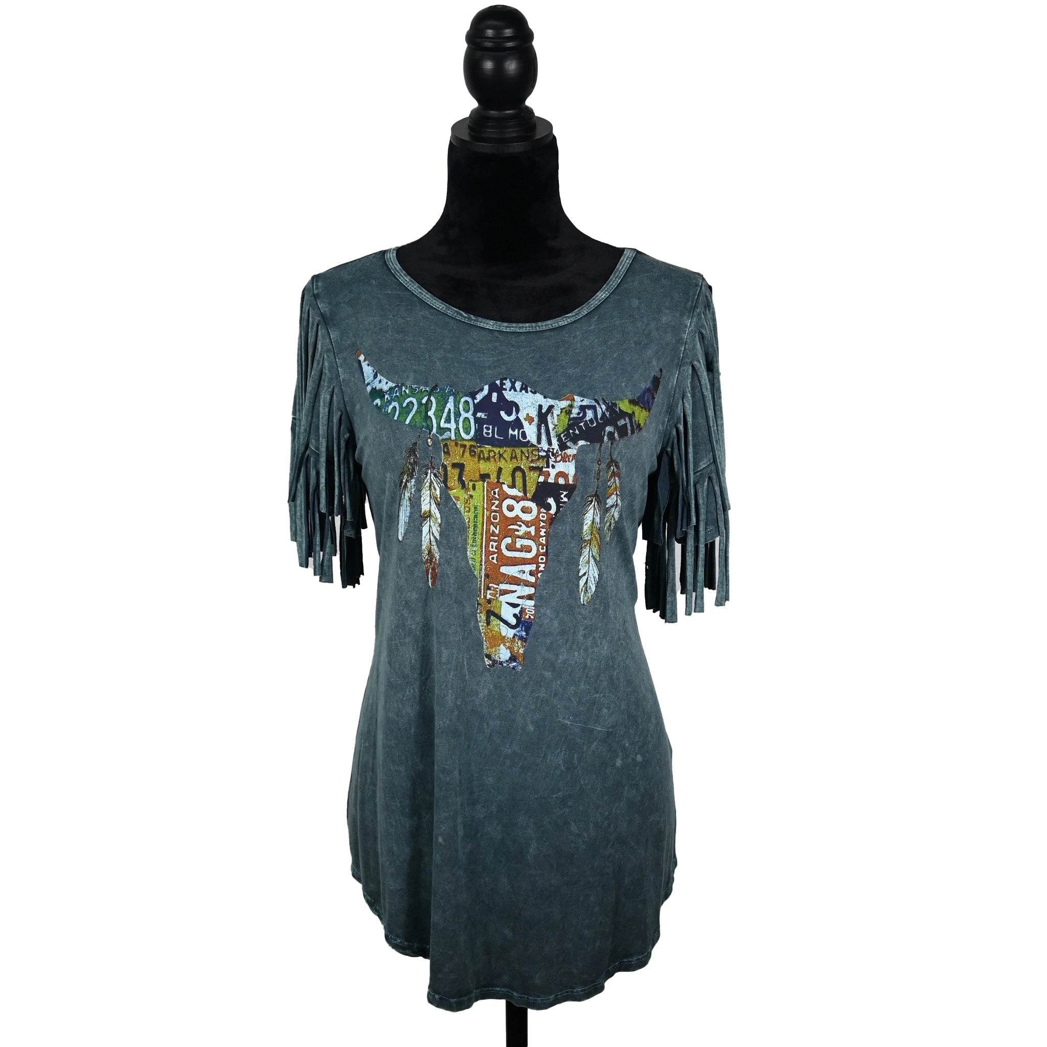 This eye-catching tee in stone wash teal features fringe sleeves and a bold longhorn graphic made from vintage license plate...