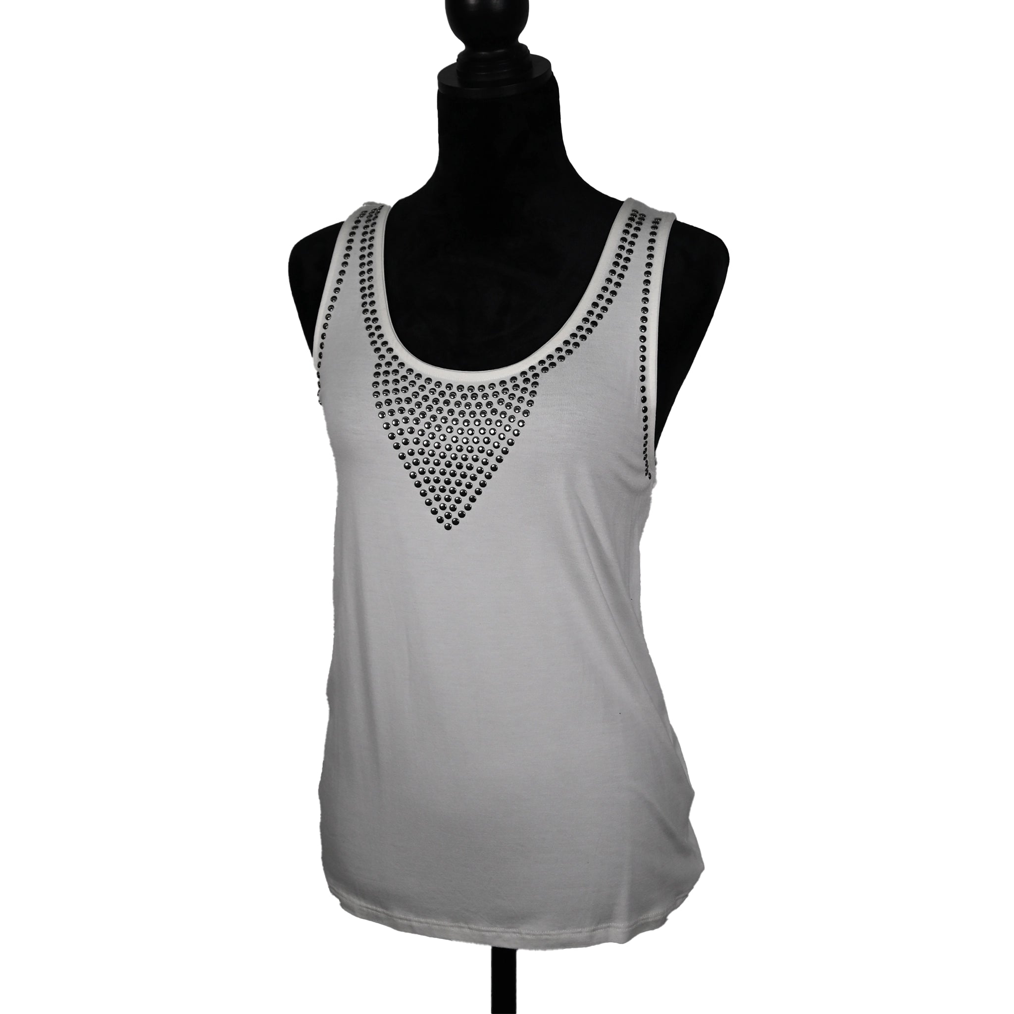 Add a little edge to your basics with this white tank featuring a striking studded stone design along the neckline...