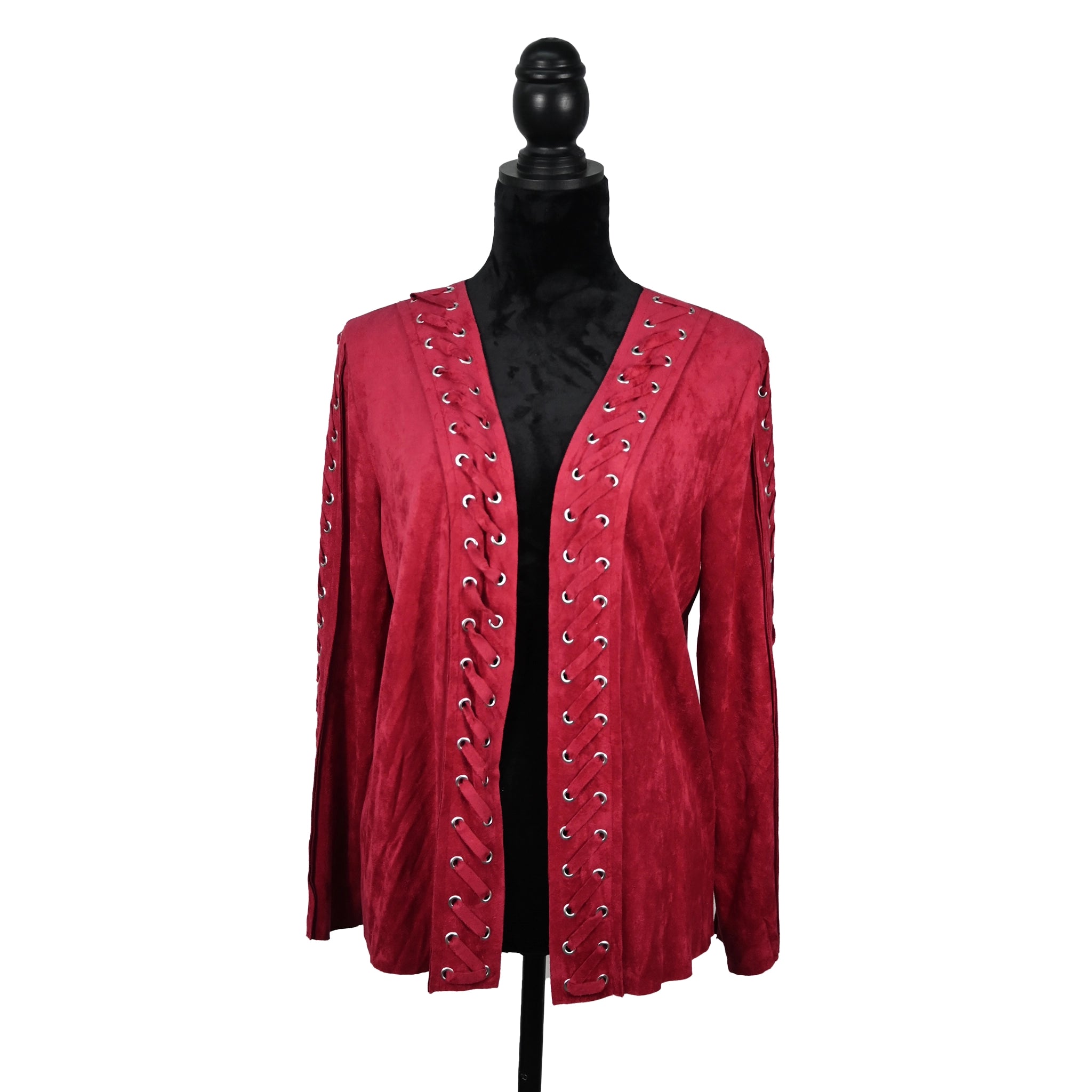 Bold and edgy, this red faux suede jacket features striking lace-up grommet detailing along the front and sleeves. A stylish...