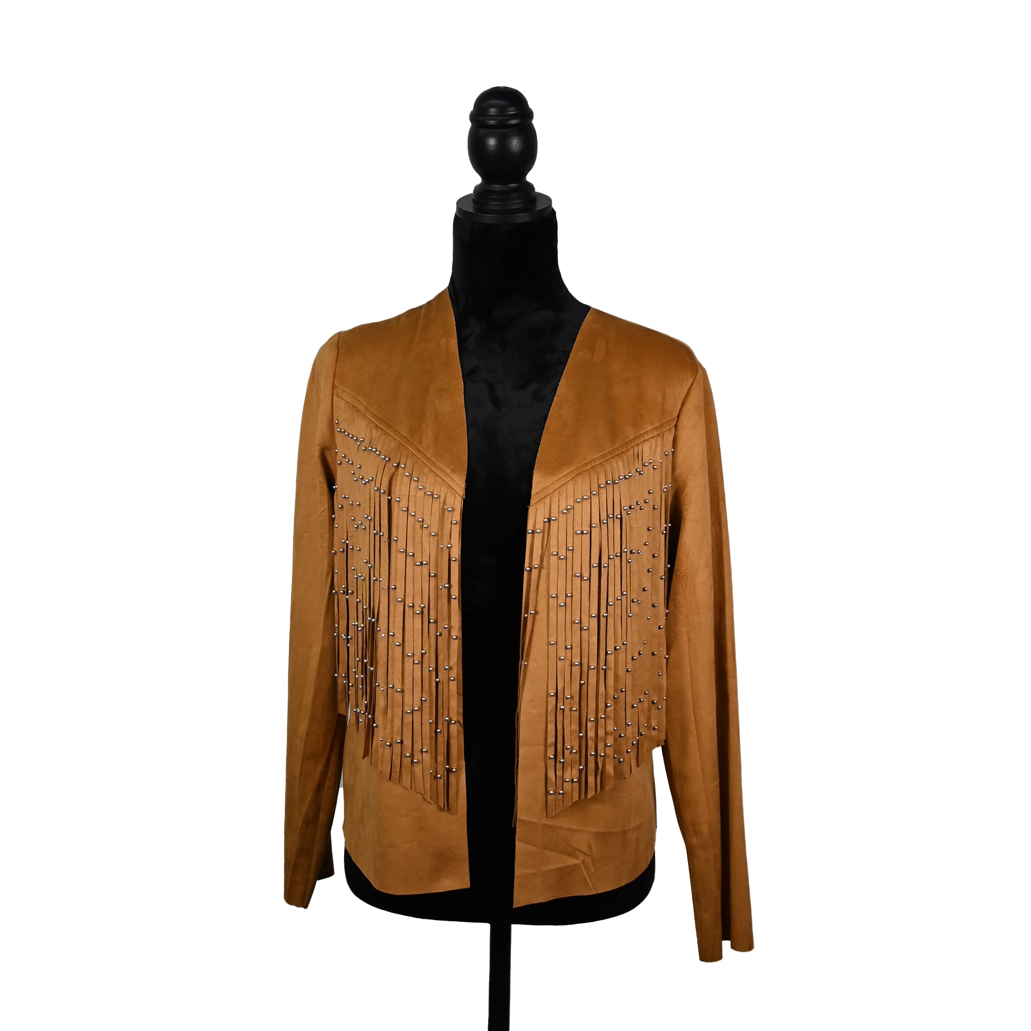 Add a touch of western flair with this tan faux suede jacket, featuring cascading fringe adorned with silver beads. Lightweight...