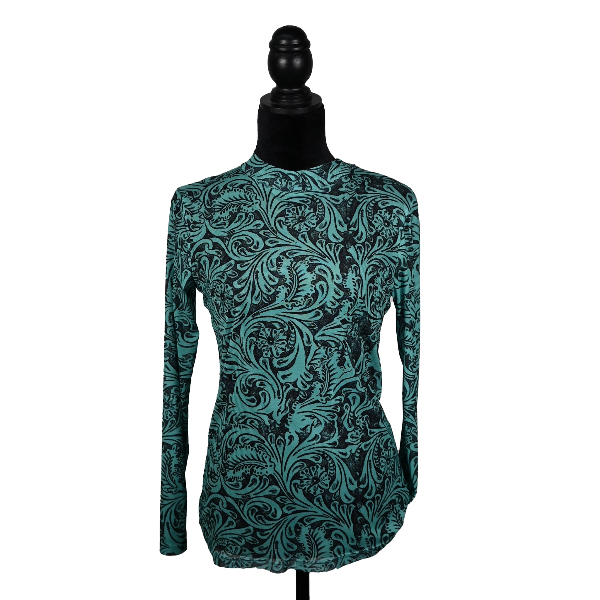 Add a touch of rodeo elegance with the Turquoise Western Scroll Top. Featuring a bold scrollwork pattern in rich turquoise...