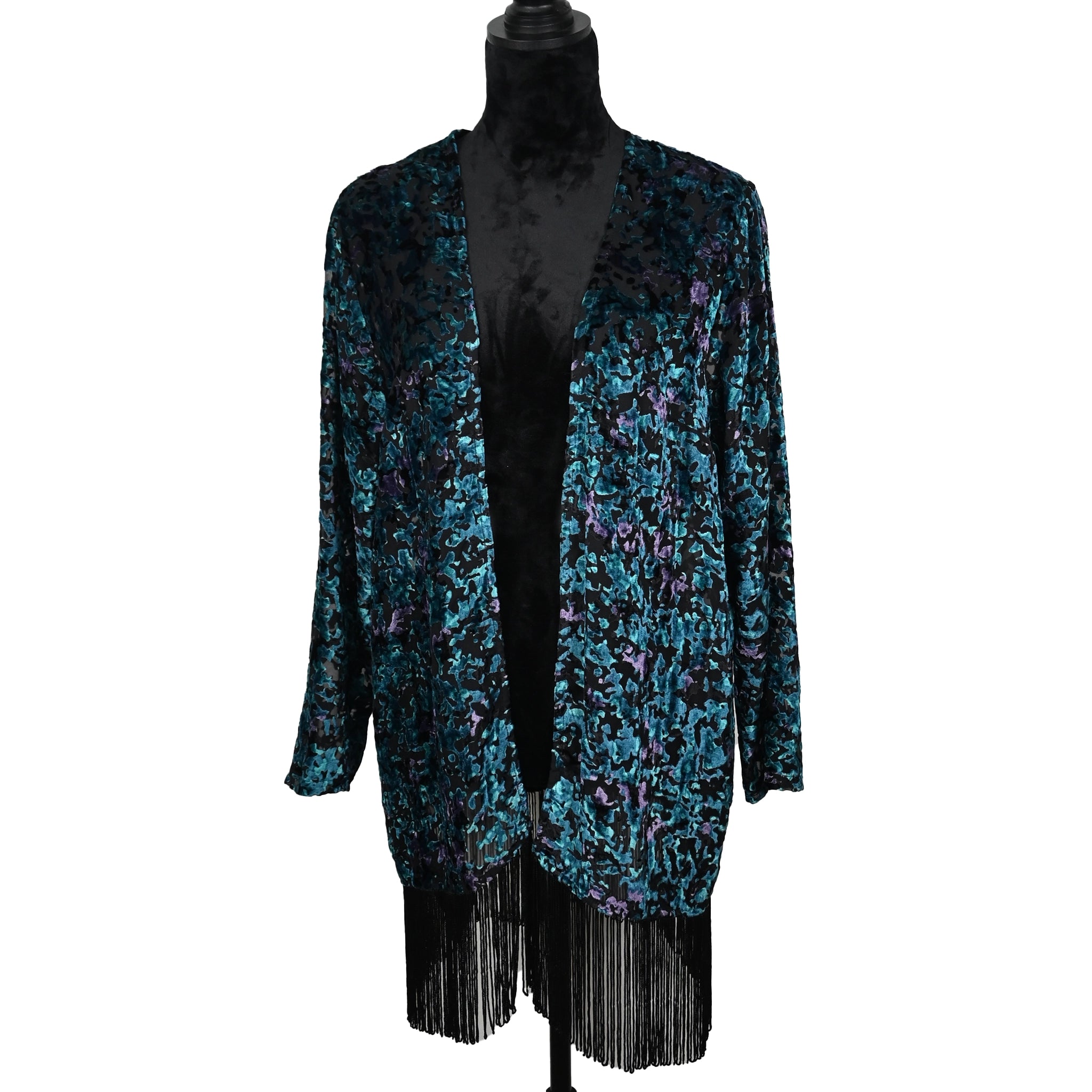 Step into luxe boho glam with this velvet burnout cardigan featuring a hypnotic laser-cut print in rich shades of dark...