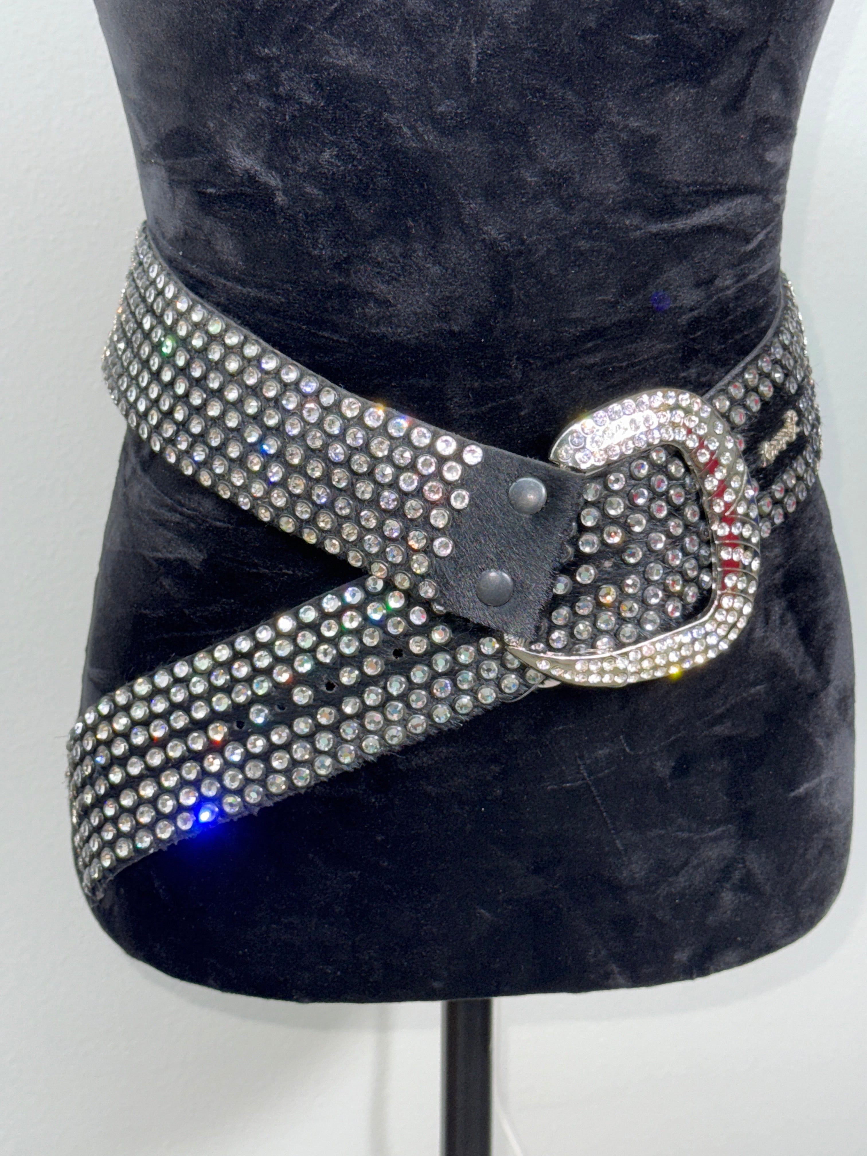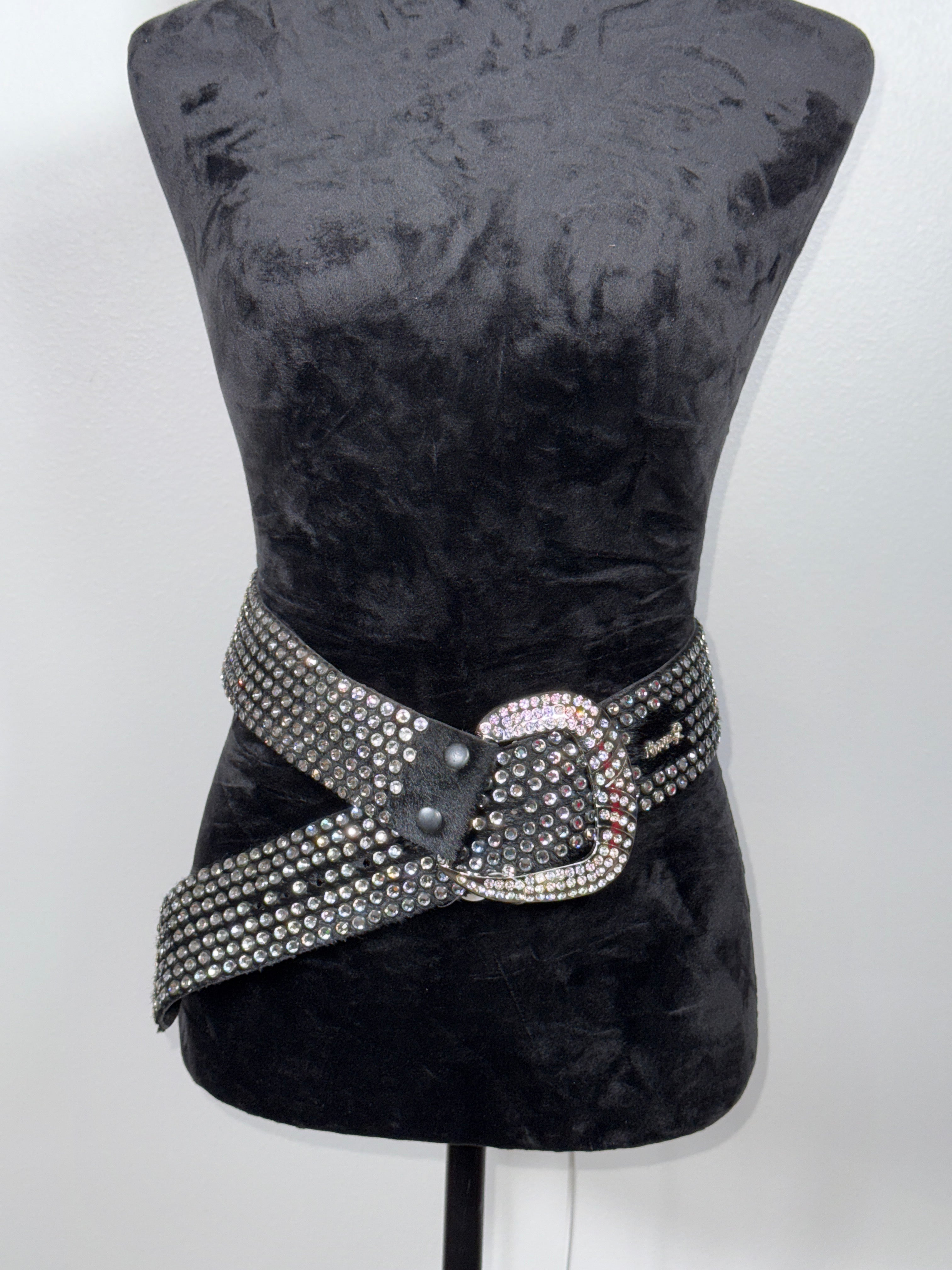 Make a bold statement with this one-of-a-kind Vintage Kippy 7-row black hairhide belt, measuring a striking 2.25 inches wide. Its...
