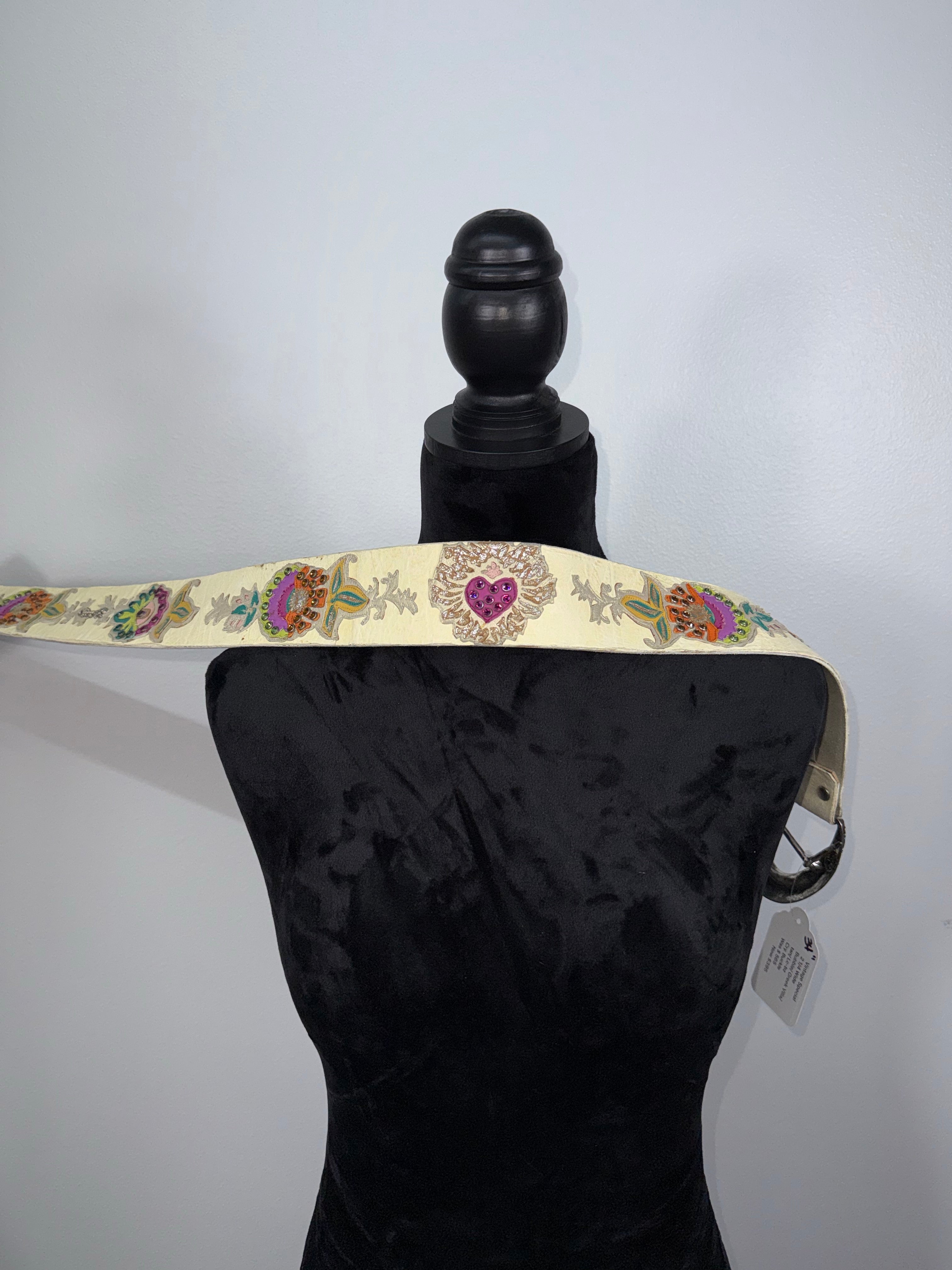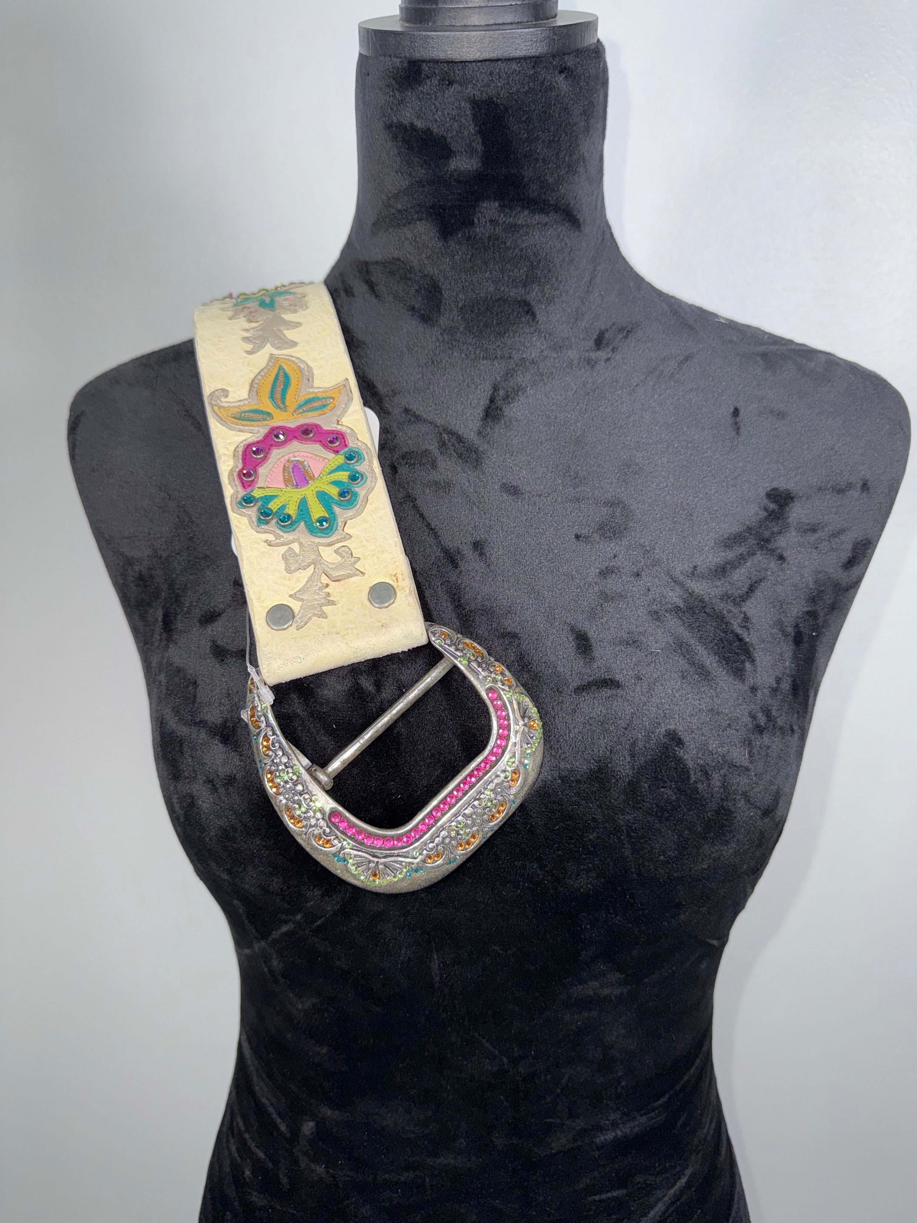 This is a beautiful off white textured leather, with multi colors. Size 34" K with and Inlay buckle with Fushia,...